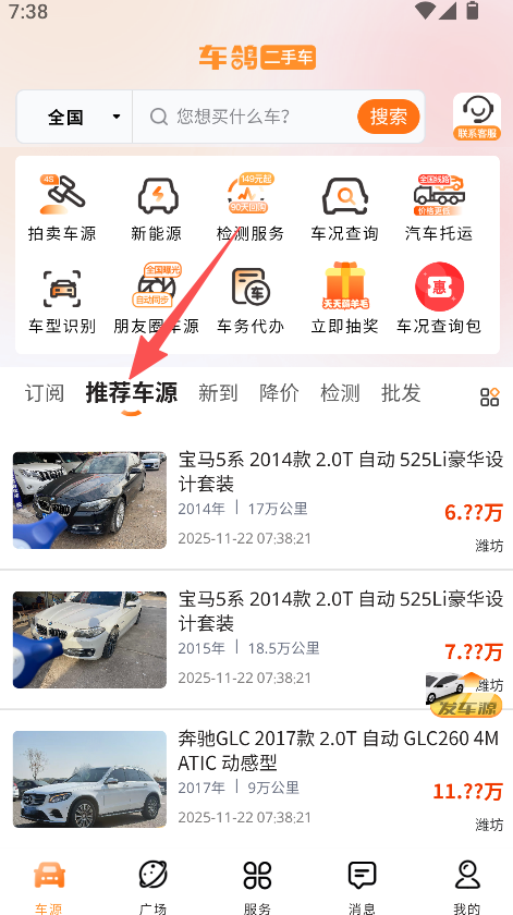 2、进入推荐车源,浏览宝马、奔驰等车型,查看车况描述。