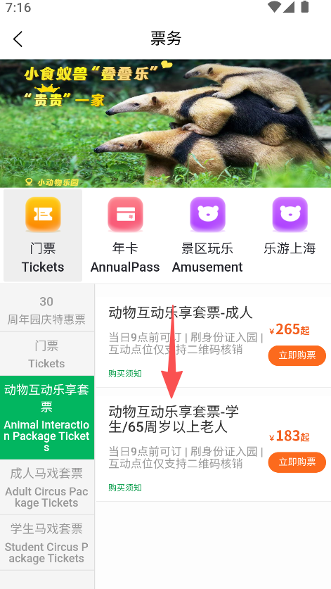 2、票务类型多样,有门票、年卡、动物互动套票,覆盖成人、学生、老人等不同游客的购票需求。