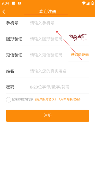 2、在注册页,点击【手机号等】输入框,开始填写注册所需的信息内容。