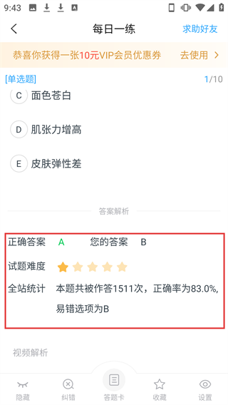 4、答题后可查看【正确答案】【您的答案】【试题难度】【全站统计】等信息,了解答题情况及易错点。