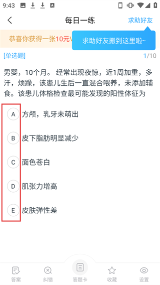 3、在每日一练题目界面,可解答如男婴夜惊多汗类的【单选题】。