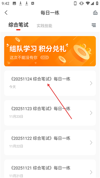 2、在每日一练列表中,点击【《20251124综合笔试》每日一练】,可参与当天的综合笔试练习。