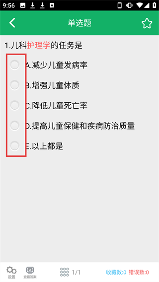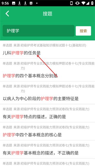 3、在搜题结果中点击题目,如【儿科护理学的任务是】,进入答题界面。