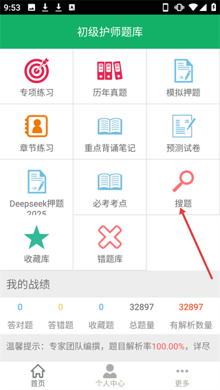 1、在【初级护师题库】页面点击【搜题】图标,进入搜题页面。