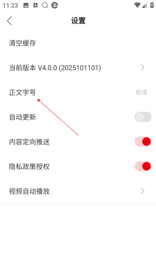3、在设置页,点击【正文字号】,进入字号调整的具体设置页面。