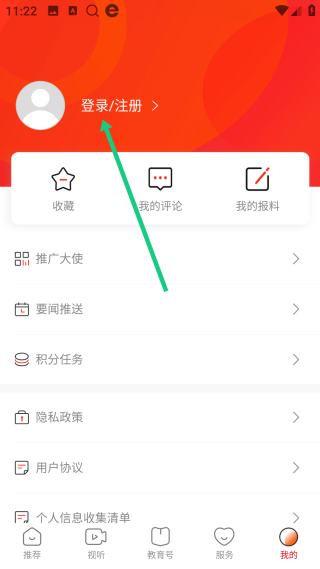 2、在个人中心页,点击【登录/注册】,进入账号的登录或注册界面。