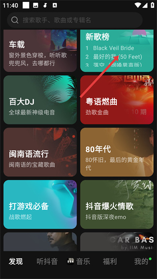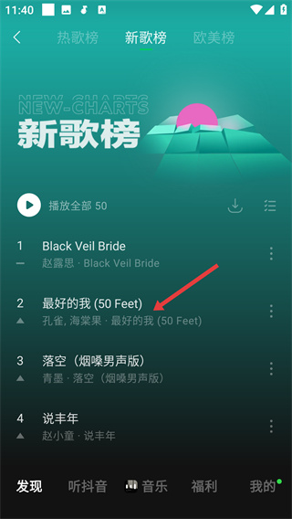1、在音乐APP发现页面点击【新歌榜】,进入新歌榜歌曲列表页面。