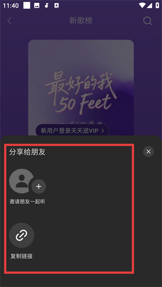 4、在分享选项菜单中,可选择【复制链接】或【邀请朋友一起听】等方式,完成歌曲分享操作。