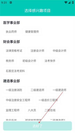 2、在登录页面,点击【新用户注册】选项,需先选择感兴趣的项目分类,完成后点击【选好了】。