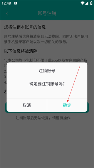 4、在弹出的注销账号提示中,点击【确定】按钮,即可完成账号注销操作。