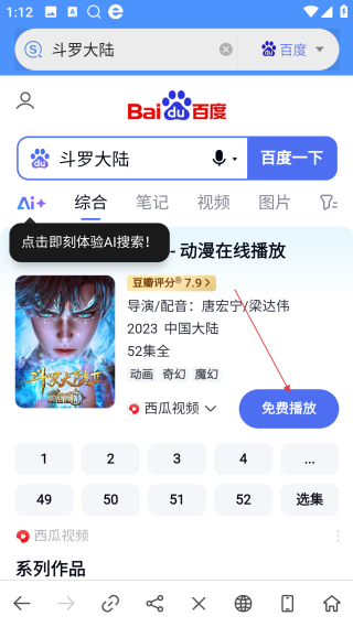 3、搜索完成后在搜索结果页,找到目标内容,点击【免费播放】进入对应内容页面。