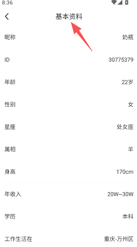 2、点击用户进入基本资料页,可了解其年龄、星座、收入等详细情况。