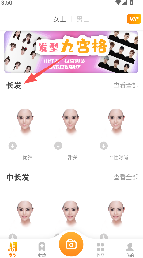 1、打开软件,选择发型类型(如长发),查看全部风格。