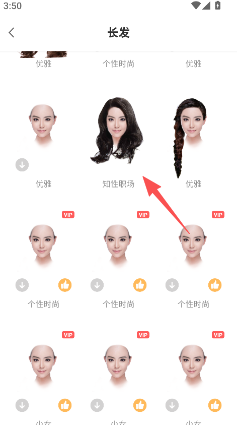 1、具备发型分类功能,可选择长发、中长发等类型,查看对应风格的发型,快速找到心仪款式。