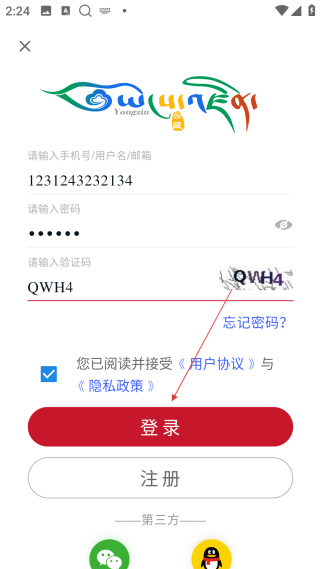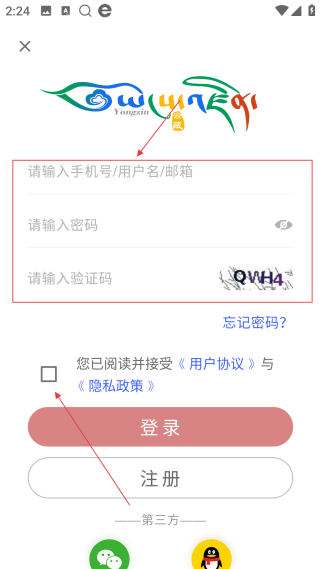 3、在登录页,填写【对应信息】,并勾选【协议】完成账号输入。