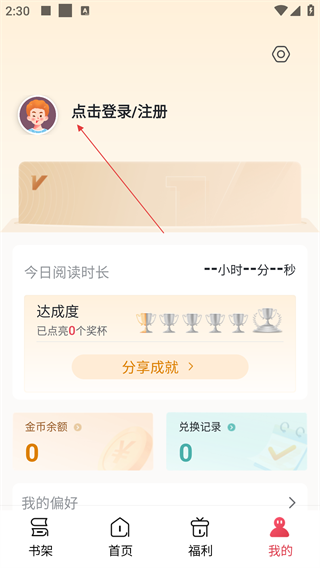 2、在个人中心页面,点击【点击登录/注册】,进入登录界面,准备进行账号登录。