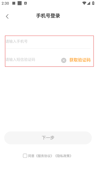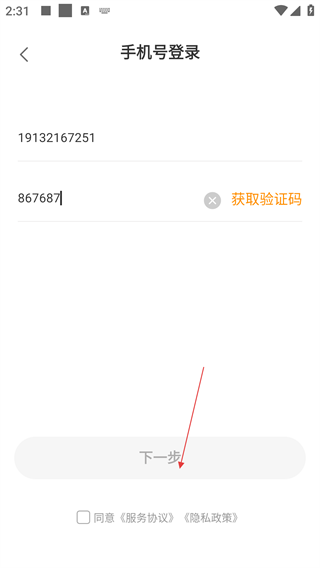 3、在手机号登录界面,输入手机号码和短信验证码,勾选同意《服务协议》《隐私政策》,为登录做准备。