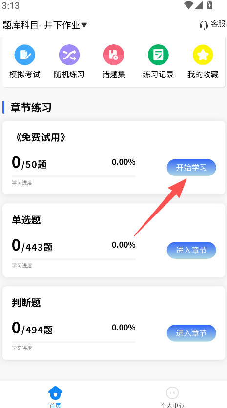 2、进入对应科目页面,选择模拟考试、章节练习等模块,或参与单选题、判断题练习。
