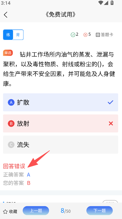 3、做题时若回答错误,可查看正确答案及解析,还能收藏题目、切换上下题。