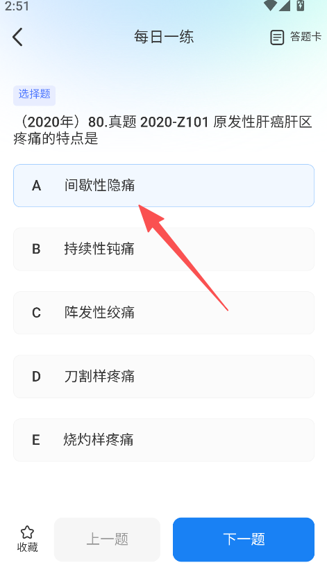 1、打开软件,选择开始刷题或每日一练,进入做题页面,选择答案,完成练习。
