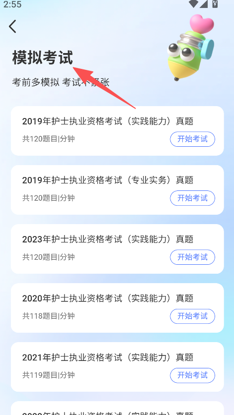 2、进入模拟考试模块,选择对应年份真题,开始考试,实战热身。