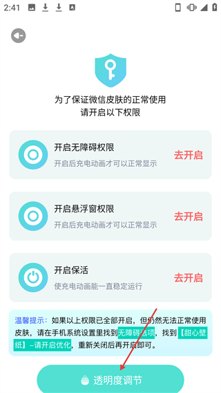 4、为保证微信皮肤正常使用,需依次【开启无障碍权限】【开启悬浮窗权限】【开启保活】。