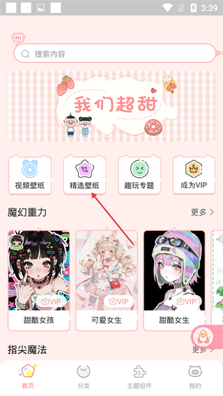 1、在应用首页点击【精选壁纸】选项,进入壁纸选择页面。