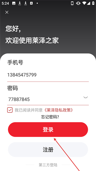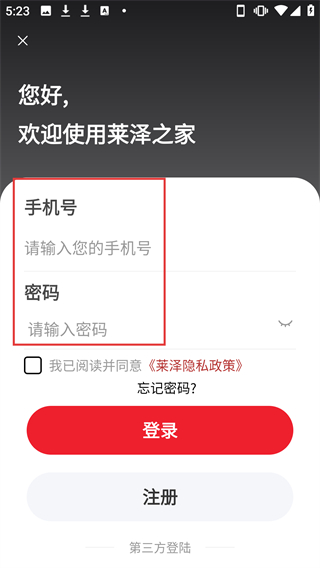 3、在莱泽之家登录界面,输入【手机号】和【密码】,并勾选同意隐私政策。