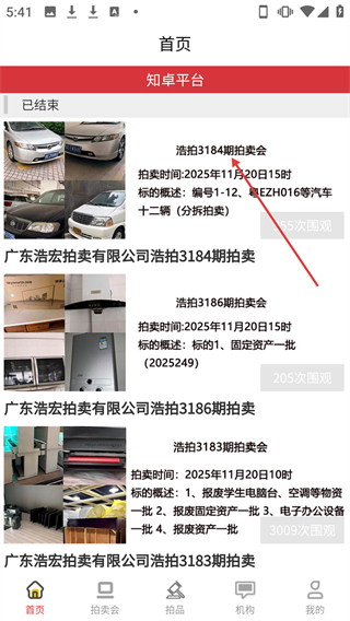 1、在知卓平台首页,点击【浩拍3184期拍卖会】进入拍卖会详情页。