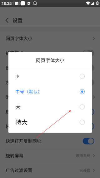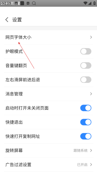 3、在设置页,点击【网页字体大小】,进入字体大小调整页面。