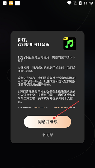1、在【苏打音乐】的权限申请弹窗中,点击【同意并继续】按钮进入应用。