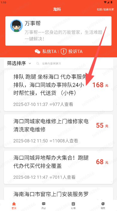 2、在首页浏览商家列表如“万事帮”、点击目标服务“排队跑腿坐标海口代办服务”进入详情页。