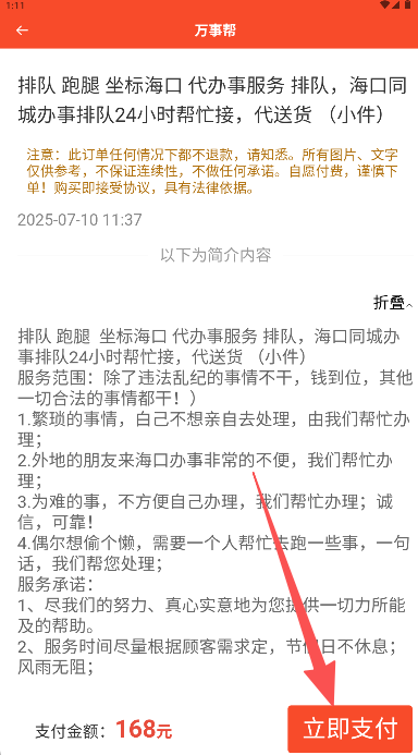 3、在服务详情页确认内容与金额、点击“立即支付”按钮完成订单支付。