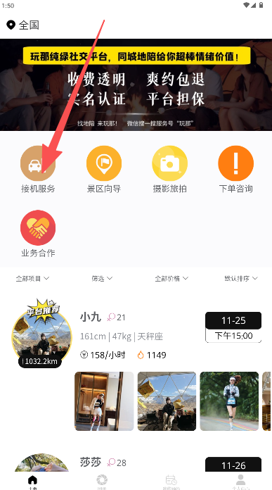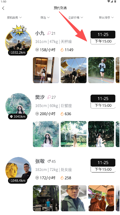 2、筛选地陪服务者点击目标服务者如“小九”进入其详情。