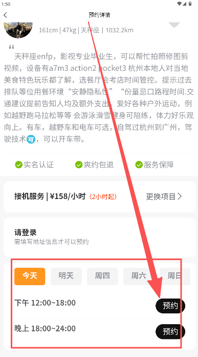 3、在服务者详情页选择服务项目与时间、点击“预约”进入预约流程。