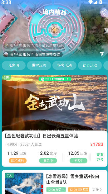 2、在页面中选择“境内精品游”,查看各类精选旅游产品与详细行程安排。