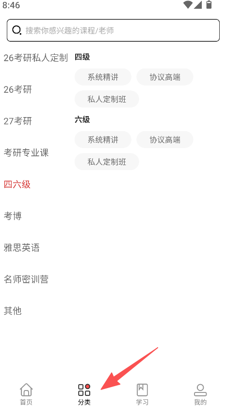 1、考试类别划分细致,覆盖26考研、27考研、四六级等多种考试类型,可快速定位对应考试的课程资源,减少查找的繁琐步骤。