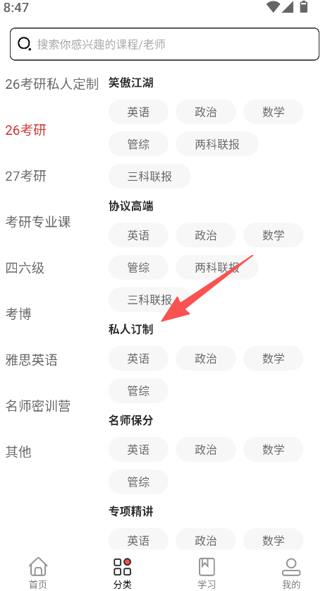 2、在类别下选择课程类型如私人定制班,找到目标课程。