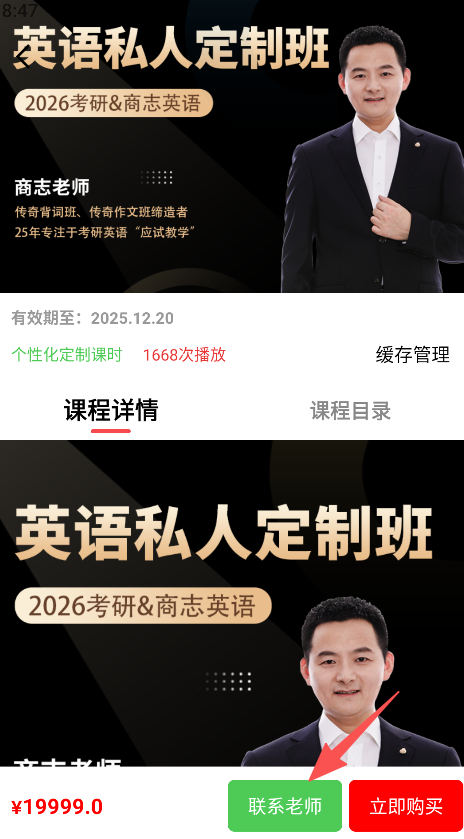 3、点击课程进入详情页,查看信息后选择联系老师或立即购买。