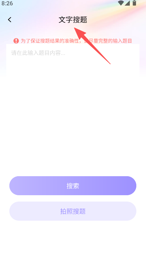 1、打开学法减分免费进入文字搜题页面,输入题目内容后点击搜索。