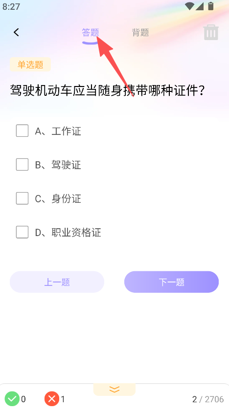 3、展示题型以单选题为主,搭配上一题下一题切换功能,适配学法减分常见的题目练习形式,提升练习过程的流畅性与适配性。