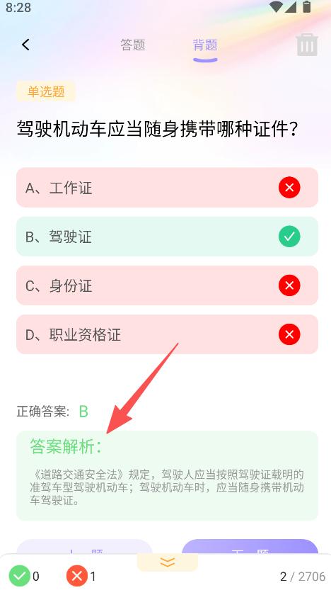 3、查看答题结果,切换到背题板块可查看正确答案及解析。