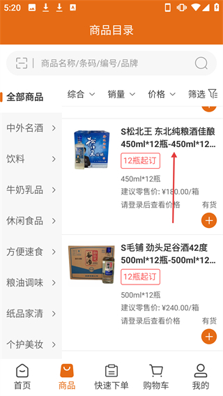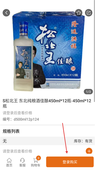 2、在商品目录页面点击【S松北王东北纯粮酒佳酿】商品条目,即可进入该商品的详情页面。