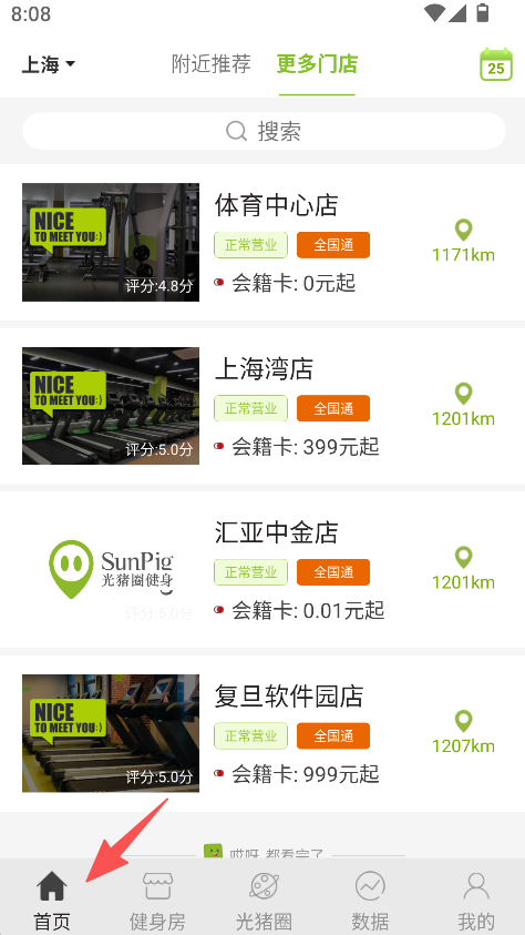 1、进入首页,点击更多门店,查看各门店营业状态、会籍卡等信息。