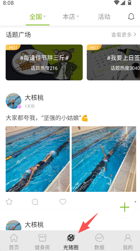 2、光猪圈板块融合话题广场与用户动态,既有时效性话题也有用户健身分享,丰富健身相关的互动内容,增强健身过程中的社区参与感。