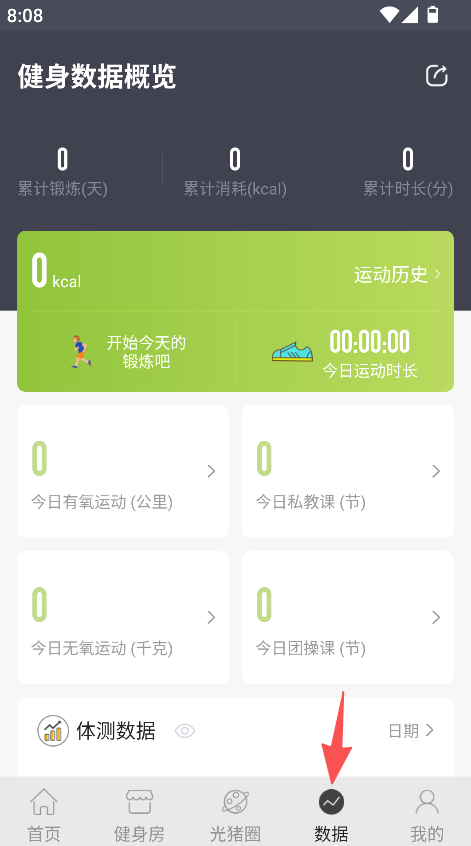 3、进入数据页面,查看健身数据概览,含累计锻炼及今日运动相关数据。