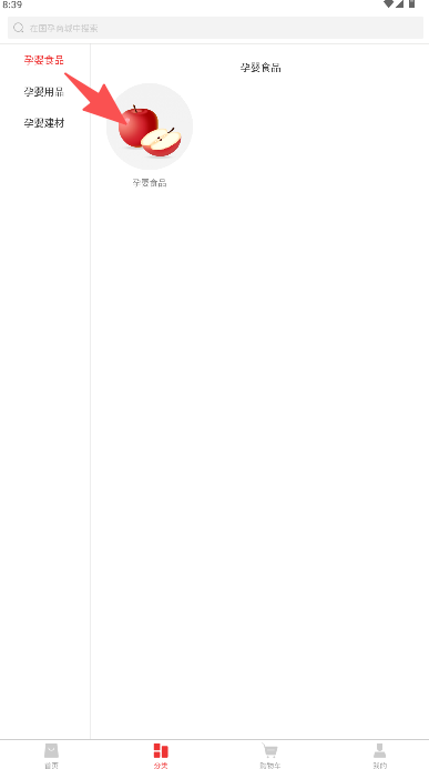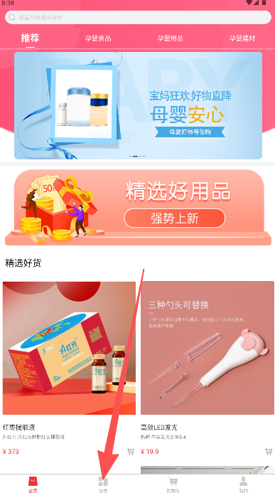 1、提供商品分类浏览功能,支持按孕婴食品、孕婴用品等类别筛选查找目标商品。
