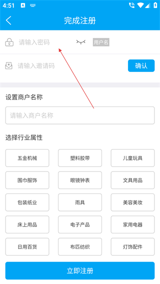 4、在完成注册页填写密码、商户名称等信息,选择行业后点击【立即注册】完成操作。
