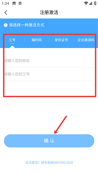 4、进入注册激活页,选择【工号】激活方式,填写姓名与工号信息,确认内容后点击【确认】按钮完成激活。