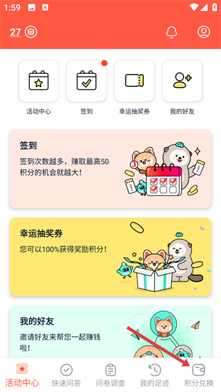 3、任务类型丰富且难度较低,签到、邀请好友等辅助任务轻松上手,搭配问卷答题快速累计积分,加速兑换心仪奖励。